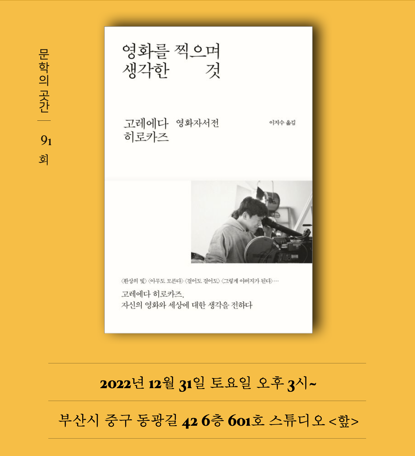 91회 <문학의 곳간>에선 고레에다 히로카즈의 영화 자서전 『영화를 찍으며 생각한 것』(이지수 옮김, 바다출판사, 2017)을 읽어보려고 합니다. 그간 만들어온 영화 만큼이나 고레에다 히로카즈의 글 또한 정갈하고 사려깊습니다. 적어도 한 편 정도는 이 감독의 영화를 보지 않았을까 싶어요. TV 다큐멘터리 연출자 출신이어서인지 보통 사람들의 평범한 모습에 깃들어 있는 생생함을 구현하는 데 탁월한 작가입니다.